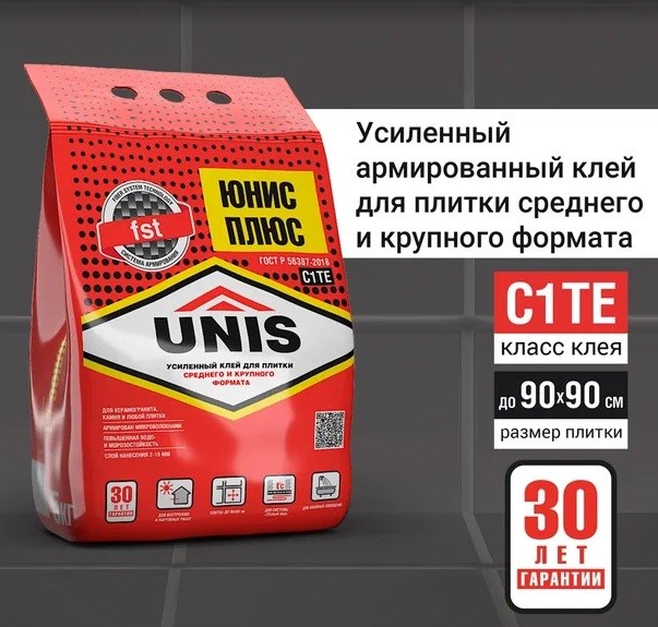 Клей для плитки Юнис Плюс 5 кг Особопрочный плиточный клей Unis Плюс представляют собой сухую смесь на основе цемента. Может быть использованы для наружных и внутренних работ. Клей плиточный Unis Плюс применяется для облицовки любых оснований плиткой, в том числе и тяжелой. Может использоваться для работы по старой плитке и оштукатуренной поверхности. Клей для плитки Unis Плюс обладает высокой адгезией. Экспертизы и заключения Сертификат соответствия системы менеджмента качества требованиям ГОСТ Р ИСО 9001-2001(ИСО 9001:2000). Сертификация в соответствии с законодательством РФ. Состав клея Юнис Плюс: • цемент, • песок, • химические добавки. Рекомендации к Юнис Плюс Кроме изложенной на упаковке информации о способах применения клея Юнис Плюс, при работе с ним следует руководствоваться инструкциями по ведению общестроительных работ и технике безопасности в строительстве. При сомнении в возможности конкретного применения материала, следует самостоятельно испытать его или обратиться за советом к производителю. Техническое описание не может заменить профессиональной подготовки при выполнении работ. Клей Юнис Плюс не рекомендуется использовать при облицовке бассейнов, печей и каминов. РСТ ТУ 5745-020-46434927-08 ВНИМАНИЕ! Беречь от детей. Во время работы использовать перчатки. При попадании в глаза промыть их водой.