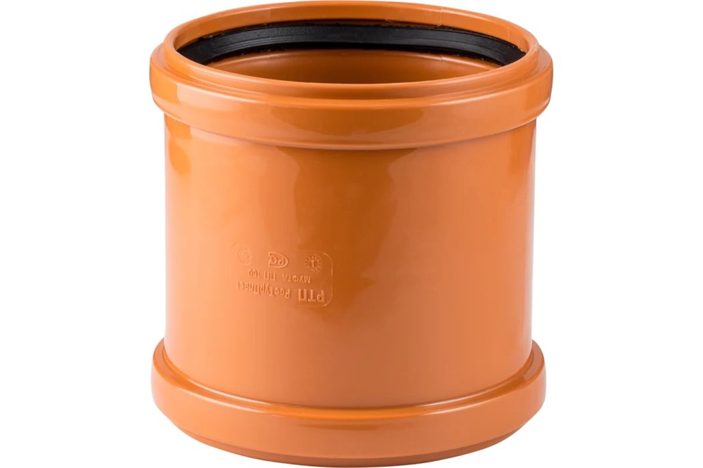 Предназначена для соединения полипропиленовых канализационных труб системы наружной канализации одного диаметра не имеющих раструб или в случае ремонта трубопровода. Герметичность соединения обеспечивается резиновыми однолепестковыми кольцами установленными в раструб муфты.
