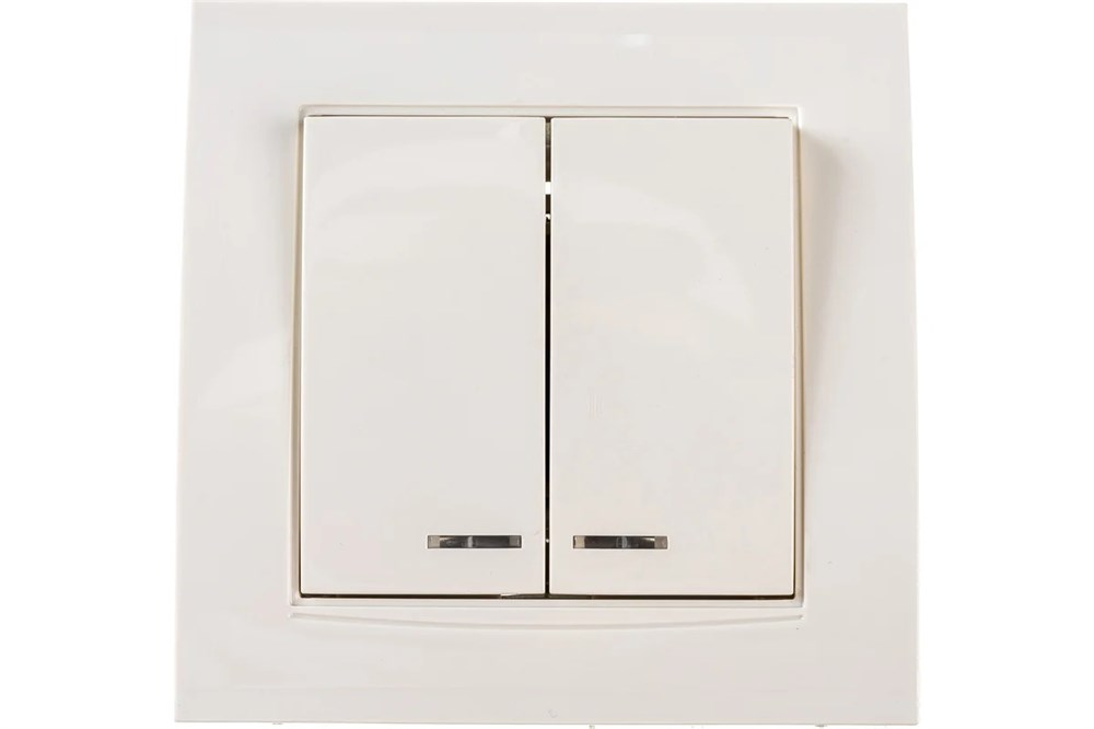 Двухклавишный выключатель с подсветкой - коммутационное устройство для включения и выключения люстр и светильников в помещениях различного назначения. Изделие выполнено из прочного и надежного пластика мягкого оттенка слоновой кости, также выключатель оснащен индикаторной подсветкой в виде синего светодиода.