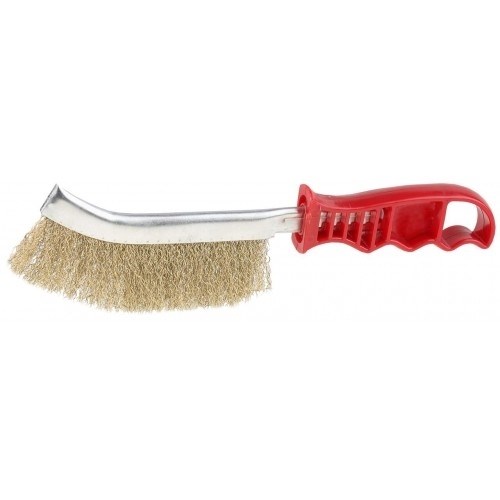 Щетка латунная STAYER 3508 серии "MASTER" имеет один ряд высококачественной латунной проволоки, размещенной на изогнутой металлической основе. На другой части основы закреплена пластмассовая рукоятка эргономичной формы с отверстием для подвешивания изделия. Инструмент предназначен для снятия ржавчины, застарелого лака или краски с каких-либо металлических поверхностей. Благодаря расположению щетины в один ряд, представленная модель наилучшим образом подходит для обработки различных труднодоступных мест, стыков плоскостей под острым углом, а также узких участков деталей и заготовок.