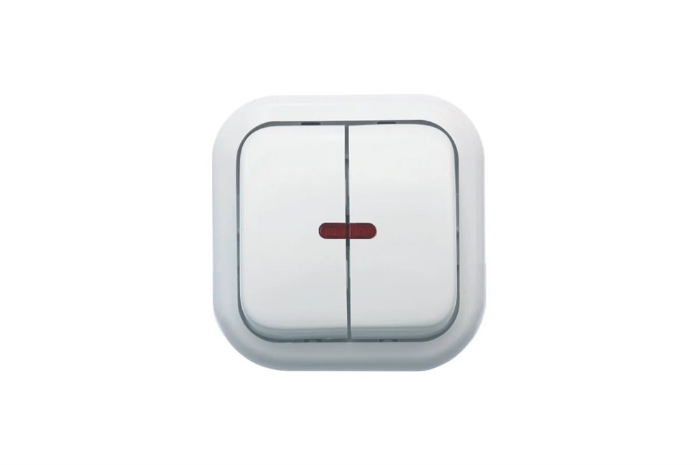 Выключатель открытой установки двухклавишный со светоиндикацией. Номинальный ток 6А. Видовые детали (корпуса, клавиши) выполнены из ABS пластика, позволяющего получить прочную, износостойкую и глянцевую поверхность. Основание механизмов розеток изготавливаются из армамида – негорючего, термостойкого, стеклонаполненного полиамида с классом негорючести ПВ-0 и стойкостью к воздействию нагретой проволокой 960C.