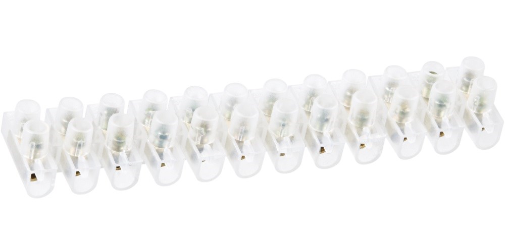 Клемная колодка состоит из 12 парных зажимов и легко режется на блоки с меньшим числом клеммных пар. Подключение электрических проводников осуществляется при помощи прижатия проводов винтами из оцинкованной стали.