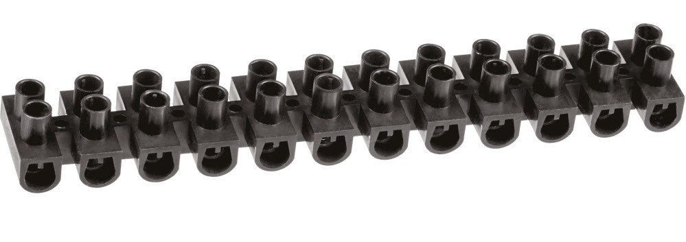 Клемная колодка состоит из 12 парных зажимов и легко режется на блоки с меньшим числом клеммных пар. Подключение электрических проводников осуществляется при помощи прижатия проводов винтами из оцинкованной стали.
