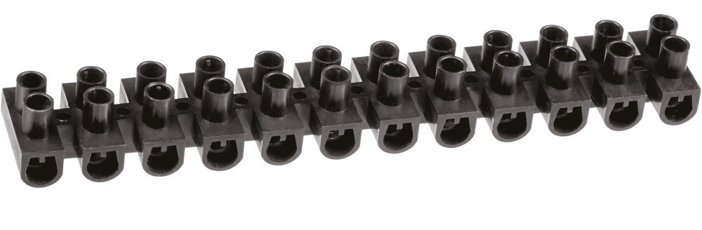 Клемная колодка состоит из 12 парных зажимов и легко режется на блоки с меньшим числом клеммных пар. Подключение электрических проводников осуществляется при помощи прижатия проводов винтами из оцинкованной стали.