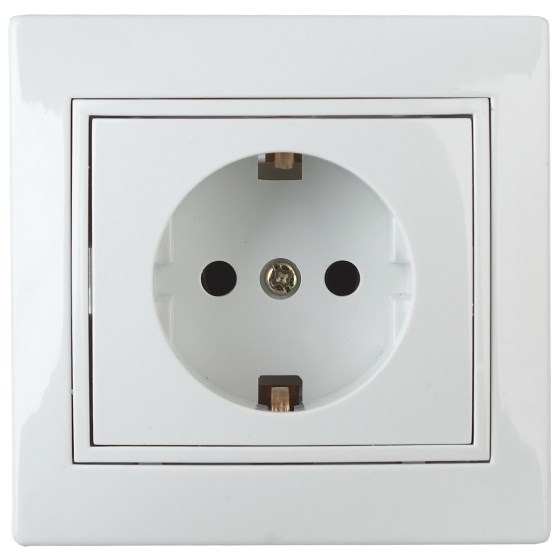 Розетка выполнена из керамики, укомплектована одноместной рамкой, оснащена винтовыми клеммами. Клеммы с двумя отверстиями позволяют соединять соседние розетки шлейфом. Установка в подрозетник производится как на монтажные лапки, так и на винты.
