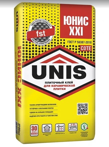 Универсальный плиточный клей Unis XXI предназначается для облицовки плиткой любых оснований и выполнения наружных и внутренних работ. Изготавливается на основе цемента, обладает отличной адгезией, высокими эксплуатационными характеристиками, морозоустойчивы и водостойки, стойки к атмосферному воздействию. Сухие смеси позволяют наклеивать плитку на различные основания, которые должны быть очищены и выровнены предварительно. Клей для плитки Юнис XXI после схватывания приобретает высокие прочностные характеристики.