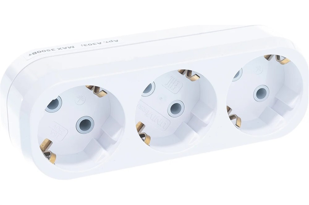 Разветвитель/тройник UNIVersal А303, трехместный, с заземлением, плоский, белый - купить в Орле недорого!