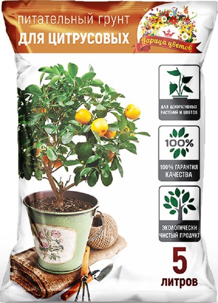 Грунт для цитрусовых Царица цветов - высококачественный натуральный питательный грунт специального назначения на основе торфа, полностью готовый к применению и прекрасно приспособленный для выращивания в комнатных и оранжерейных условиях цитрусовых растений: апельсина, лимона, мандарина, грейпфрута, цитрона, кинкана, бергамота, лайма, кумквата, помело. Допускается применение для выращивания других растений семейства цитрусовых, предъявляющих аналогичные требования к агрохимическим и физико-механическим свойствам грунта. Возможно применение в качестве подкормки, а также для подсыпки при оголении корней, усадке грунта, мульчировании почв. Способствует приживаемости растений и улучшает их декоративные качества.