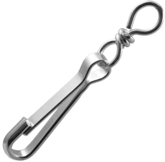 Такая конструктивная особенность предотвращает перекручивание звеньев цепей, верёвок, тросиков при вращательной нагрузке. Этот крепежный тип изделий не используется при тяжелых тяговых нагрузках и подъёмах.