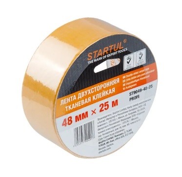 Двухсторонняя тканевая клейкая лента STARTUL Profi ST9049-48-25 используется для приклеивания настенных плинтусов, панелей и декоративных элементов, при укладке линолеума.