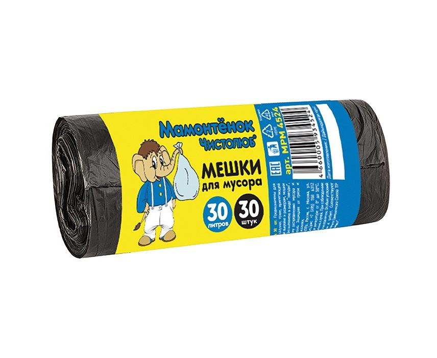 Мешки для мусора Мамонтенок MPM4524, 30л, 4.5мкм, ПНД, черные, в рулоне 30шт.