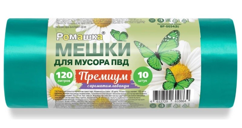 Мешки для мусора Ромашка ПРЕМИУМ ВР-0054, 120л, 70x110см, 35мкм, зеленые, запах лаванда, в рулоне 10шт.