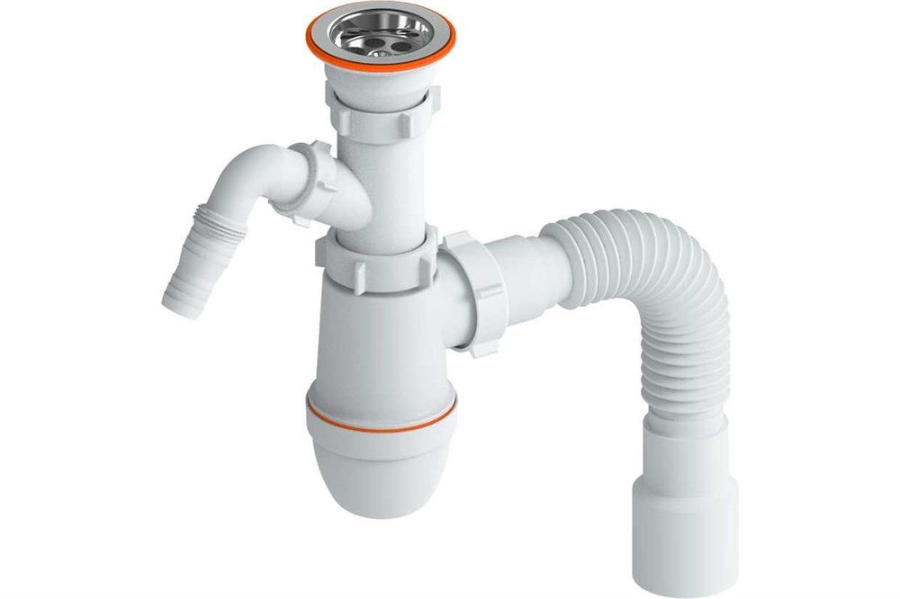 Сифон для умывальника РМС СУ-03, 1 1/2 дюйма, проход 40/50мм, с выходом под стиральную машину, с гибкой трубой