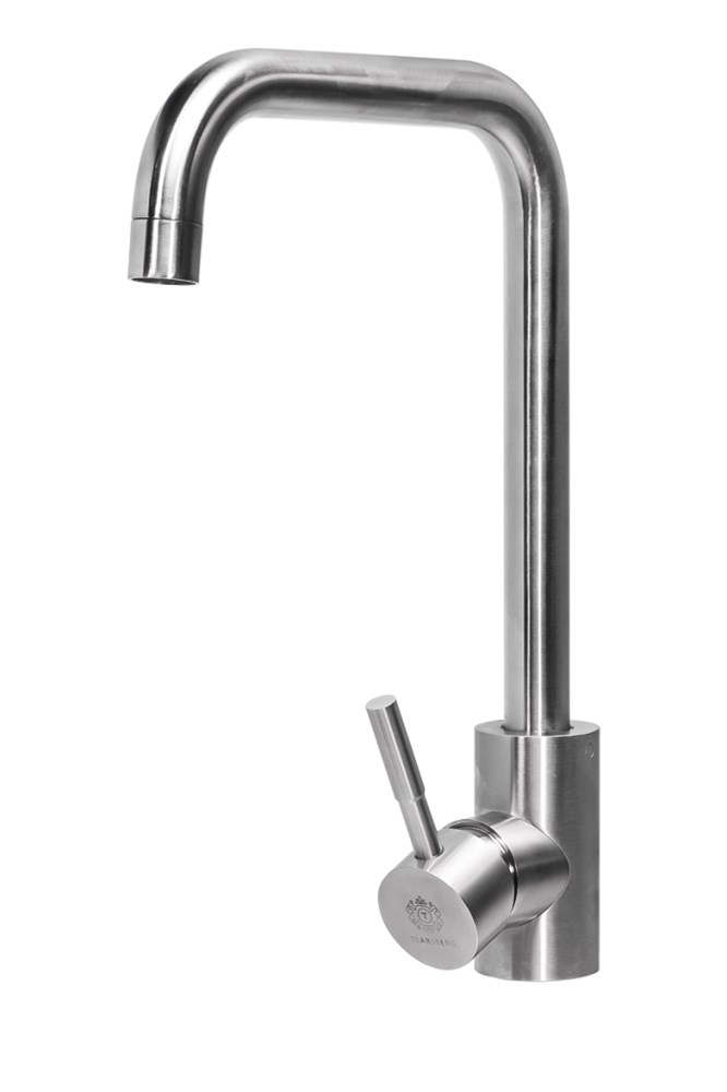 Модель однорычажная с высоким Г-образным изливом является оптимальным решением при выборе смесителя для кухонной мойки. Смеситель изготовлен из нержавеющей стали AISI-304, что обеспечивает долговечность и надежность изделия. Модель оснащена поворотным изливом большой высоты. Суммарная высота изделия 34 см, что делает смеситель высоким и подходящим для использования на кухне.