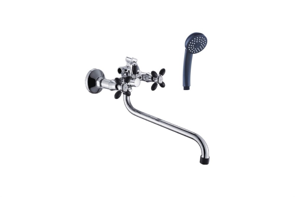 Смеситель для ванны с круглым, поворотным, длинным изливом. Переключатель "кран-душ" поворотный, шаровый расположен в корпусе смесителя для ванной и умывальника. Излив трубчатый, S-образный, снабжён экономным аэратором с пластиковой вставкой. Для регулировки горячей и холодной воды применяются кран-буксы с керамическими пластинами и увеличенным сроком службы. Вывод для подключения душевого шланга расположен в верхней части смесителя в ванную на держателе. Шланг для душа гибкий в металлической нержавеющей оплётке стандартным диаметром 1/2" длиной 150 см. Лейка душевая пластиковая, один режим струи. Элементы ручек маховиков, водосберегающая насадка и лейка для душа черного цвета.