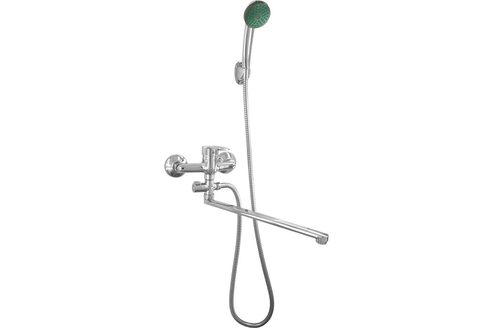 Cмеситель для ванны, картридж 35мм, излив длиной 35см. Имеет поворотный дивертор. В комплекте шланг 1.5м, однорежимная душевая лейка, держатель для лейки, эксцентрики, отражатели.