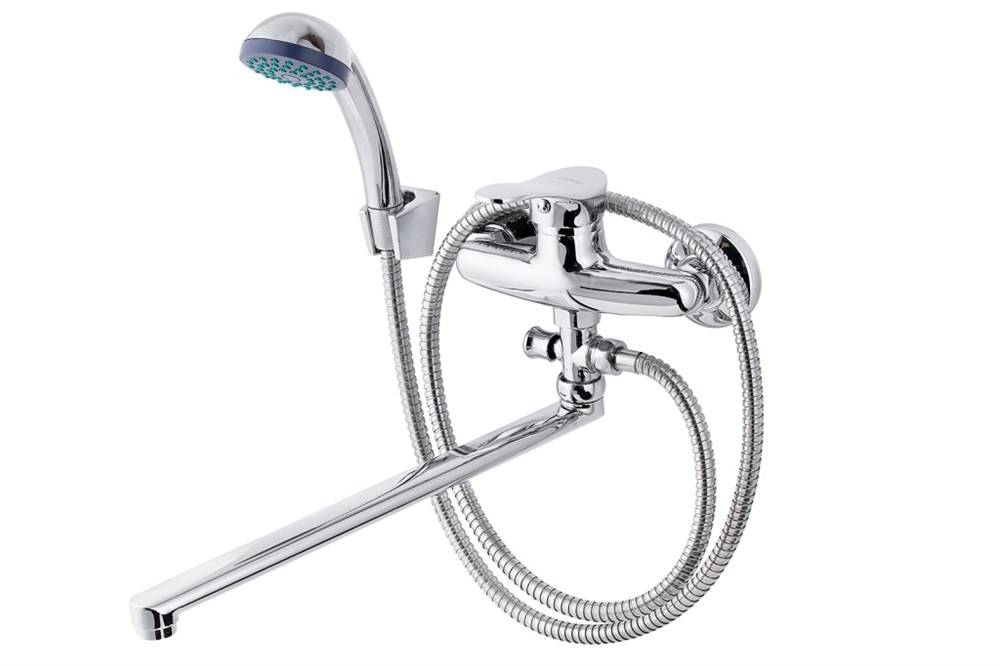 Смеситель для ванны с душем имеет однорычажную систему управления, керамический картридж в комплекте, кнопку и поворотный излив средней длины.Смешивание потоков воды осуществляется через керамический картридж. Переключение на душевую лейку в модели выполняется с помощью боковой кнопки-дивертора.