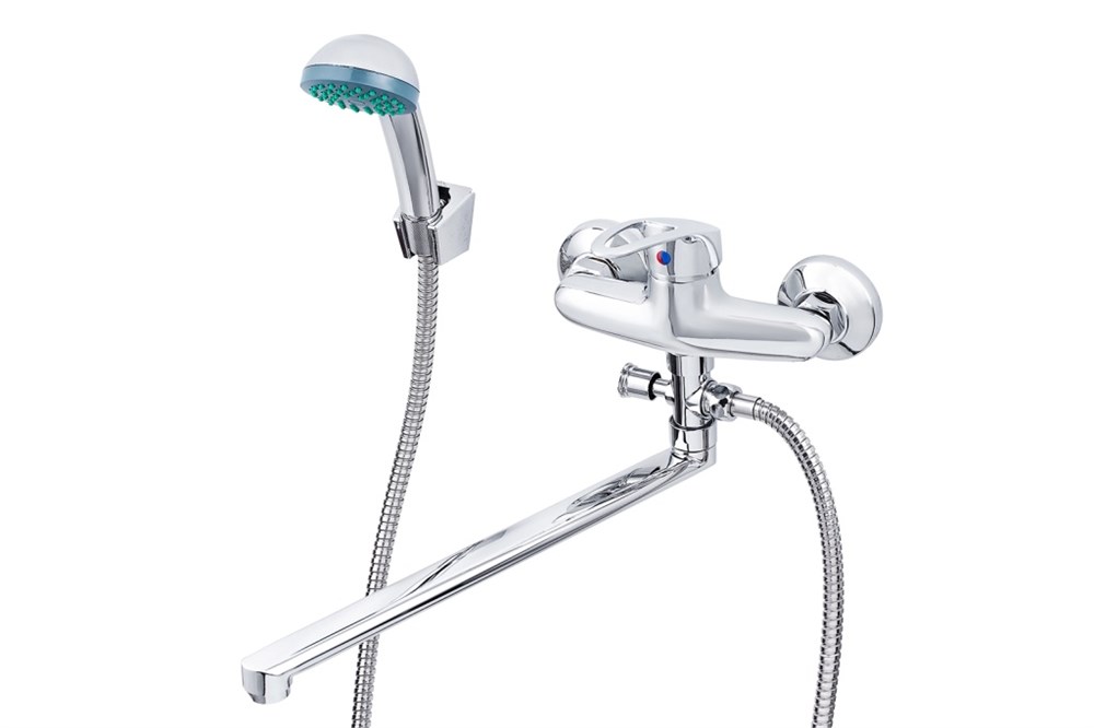 Смеситель для ванны с душем относится к кнопочному типу. Он оснащен длинным поворотным изливом, что делает модель многофункциональной. Рычажное управление позволит быстро и точно получить воду заданной температуры и напора. Изделие крепится на стену классически в двух точках, подводки для воды раздельные. Оснащен картриджем с керамическими пластинами. Кнопка переключения потоков с душа на излив расположена сбоку под корпусом. Излив длинный и поворотный, что дает смесителю возможность быть использованным в качестве общего для ванны и умывальника.