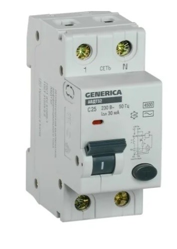 Дифференциальный автомат GENERICA АВДТ32, двухполюсный 2Р, 25А, 4.5kA, 30мА, тип С - купить в Орле недорого!